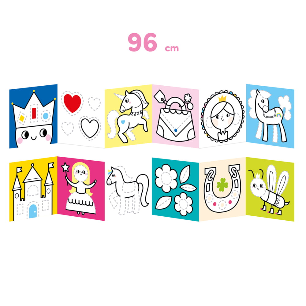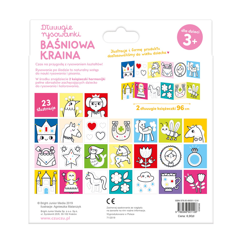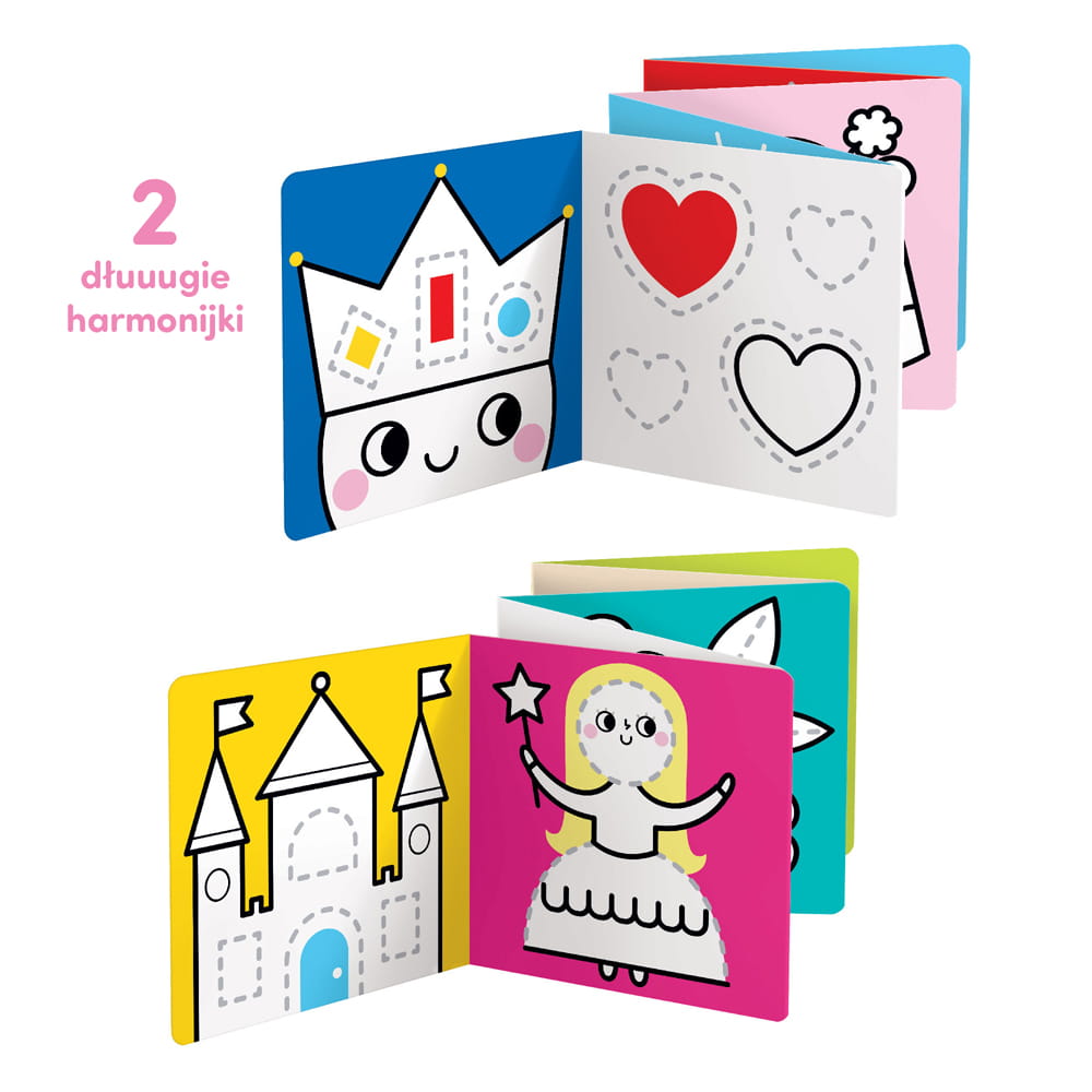 Kreatywny zestaw kryje 2 długie książeczki harmonijki. Lubiana przez najmłodszych tematyka zachęca dzieci do sięgania po kredki i farby: magiczne ilustracje, które inspirują do twórczej zabawy. Rysujcie po śladzie, kolorujcie, dorysowujcie własne elementy, doskonaląc przy tym zdolności manualne i wyobraźnię.
