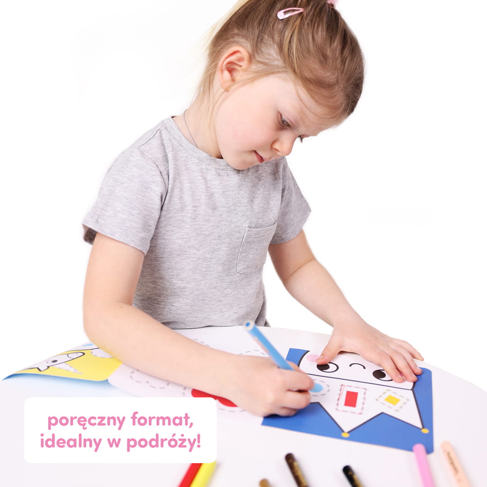 Trzylatek ćwiczy coraz bardziej precyzyjne ruchy ręką, a rysowanie po śladzie to świetne ćwiczenie zdolności motorycznych. Kolorowanie i rysowanie detali to jeden z etapów twórczej podróży, który doskonale przygotowuje do przyszłej nauki pisania. Ulubiona tematyka i wesołe zadania zachęcają dzieci do odwzorowywania kształtów i rysowania coraz bardziej szczegółowych elementów. To naturalny wstęp do nauki pisania i jednocześnie sposób na twórczą ekspresję. Upewnijcie się, że dziecko prawidłowo trzyma kredkę w dłoni. Nazywajcie kolory, bohaterów i przedmioty na ilustracjach. Dajcie się ponieść wyobraźni! Dzięki poręcznemu formatowi kolorowanki możecie mieć zawsze przy sobie. To doskonały pomysł na drobny prezent dla dziecka.