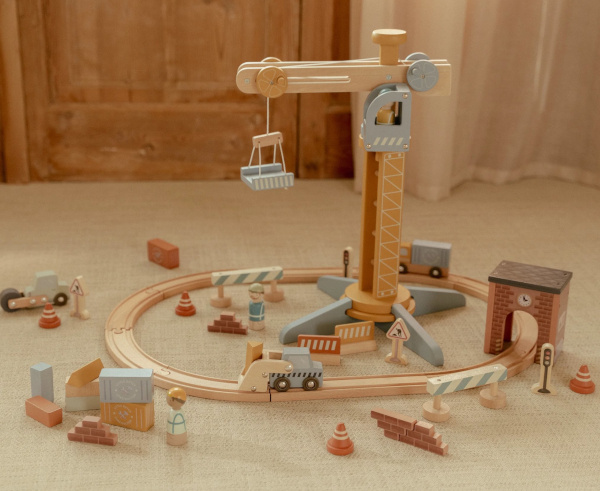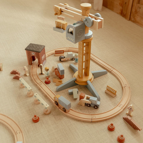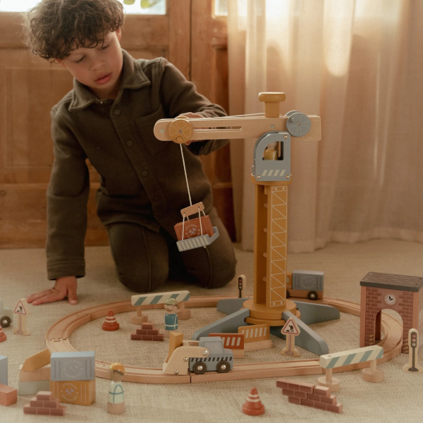 Zbudujmy wspólnie coś fajnego! Drewniany dźwig od Little Dutch to super pomysł na ciekawą zabawę. Pracownik dźwigu sprawnie załaduje na podnośnik ciężki sprzęt i przeniesie go w dowolnie wybrane miejsce. Zestaw zawiera figurki robotników, pojazdy, materiały budowlane. Jest kompatybilny z zestawem kolejki XL 100 elementów Little Dutch.