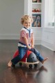 Solidnie zaprojektowane i wykonane. Jeździki zbudowane są na mocnej, drewnianej podstawie o bezpiecznych zaokrąglonych kształtach. Wyposażone w 4 plastikowe kółka obrotowe o łacznej wytrzymałości do 25kg. Siedzisko wykonane z poliuretanowej ekoskóry, dzięki czemu są miłe i miękkie w dotyku oraz łatwe w czyszczeniu i pielęgnacji. Jeździk posiada aluminiowy uchwyt pokryty miękką gumą.