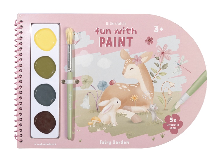 Kolorowanka z farbami akwarelowymi Fairy Garden od Little Dutch to świetny pomysł na twórczą zabawę! Wesoła książeczka zachęca maluchy do malowania, odkrywania i tworzenia. Pięć ilustrowanych stron pełnych przygód w bajkowym ogrodzie i dwadzieścia pięć pustych arkuszy to mnóstwo miejsca na wyobraźnię i własne prace artystyczne. Do książeczki dołączony jest pędzel i cztery farby akwarelowe. Cały zestaw zebrany jest w wygodnej formie zeszytu na spirali. Zestaw kolorowanek z farbami akwarelowymi wpłynie na rozwój kreatywności, motoryki małej i koordynacji ręka-oko. Świetnie sprawdzi się jako uzupełnienie pozostałych akcesoriów plastycznych od Little Dutch.