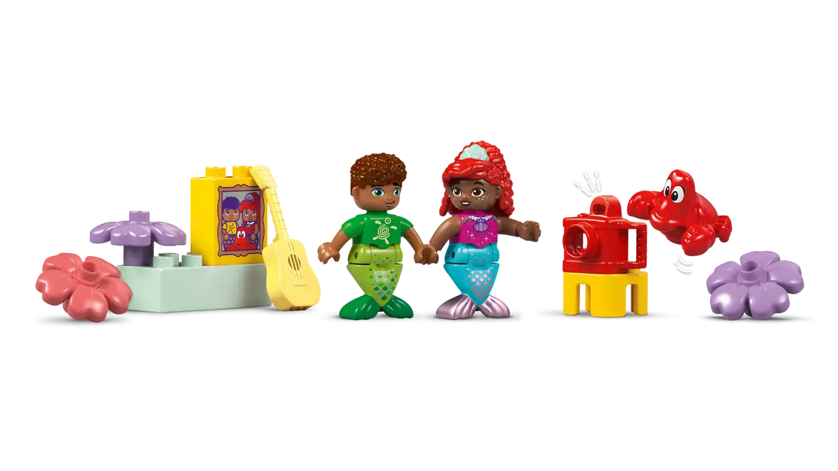 Dzieci pomogą figurce LEGO DUPLO księżniczki Disneya w przygotowaniach w jej własnej sypialni. Następnie wkroczą na parkiet, by potańczyć przy akompaniamencie muzyki Ferniego i Sebastiana, którzy grają na instrumentach. A to tylko niektóre z wielu akcesoriów inspirujących do wymyślania historii z Arielką i przyjaciółmi w rolach głównych. Wcielając się w role, dzieci uczą się nawiązywać relacje, natomiast podczas obracania parkietem tanecznym i popychania huśtawki rozwijają także zręczność.