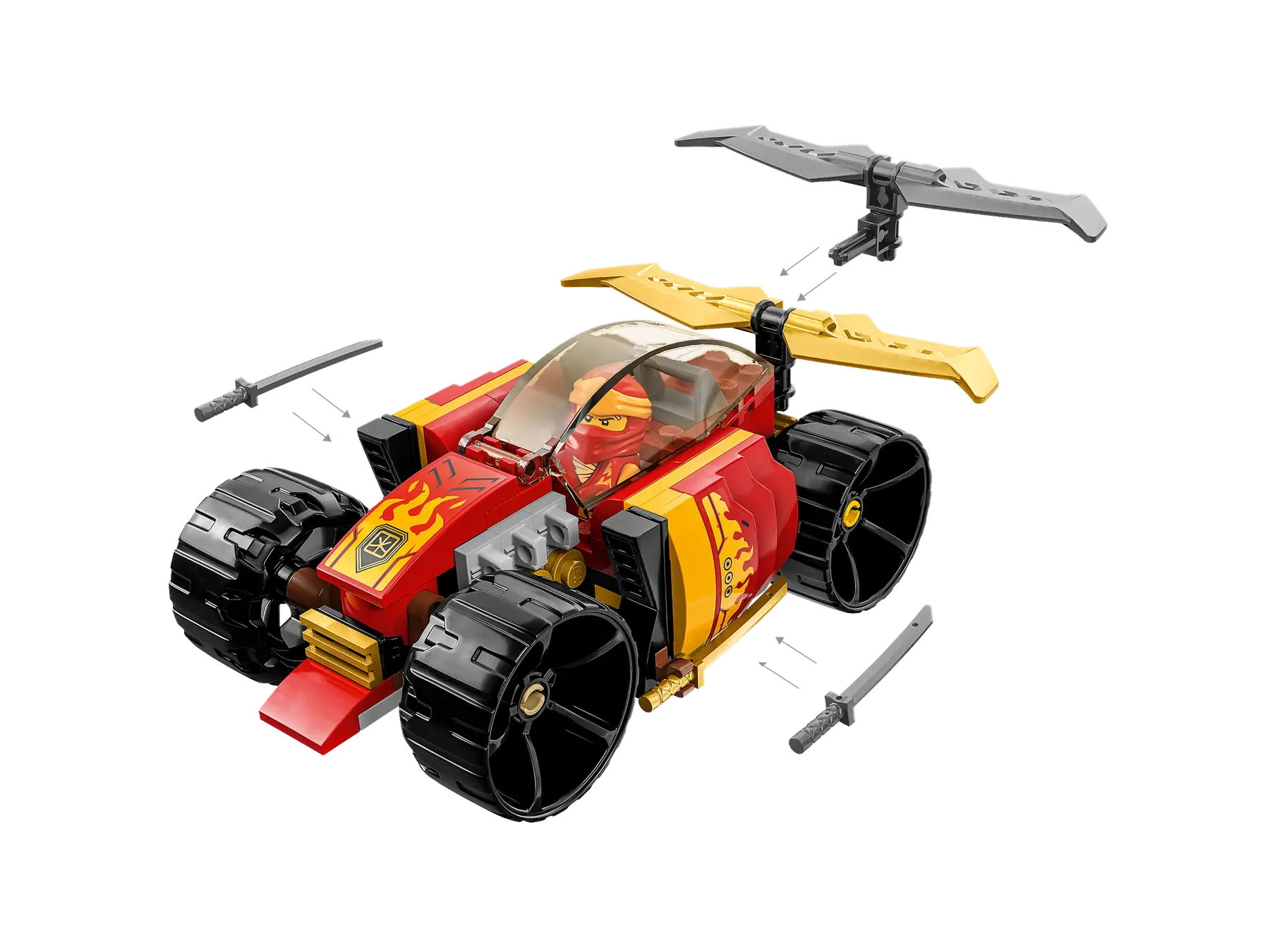W zestawie znajdują się imponujący samochód ninja i minifigurka Kaia z dwoma złotymi katanami.