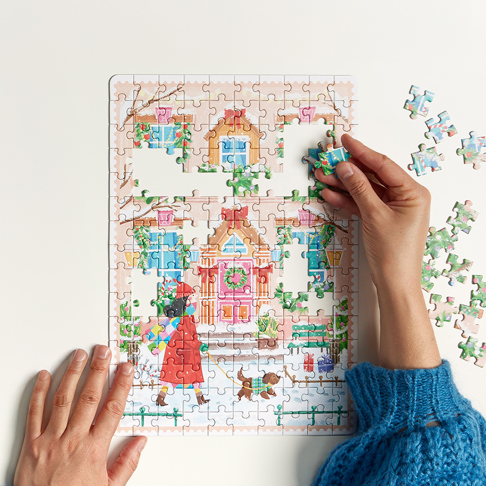 Puzzlove Zimowy spacer to przepięknie zilustrowane puzzle, które mają 150 elementów. Poczuj zimowy klimat i daj sobie chwilę na odpoczynek w ulubionym towarzystwie. Puzzlove wie, czym jest radość układania. To idealny czas na zimowe spotkania!