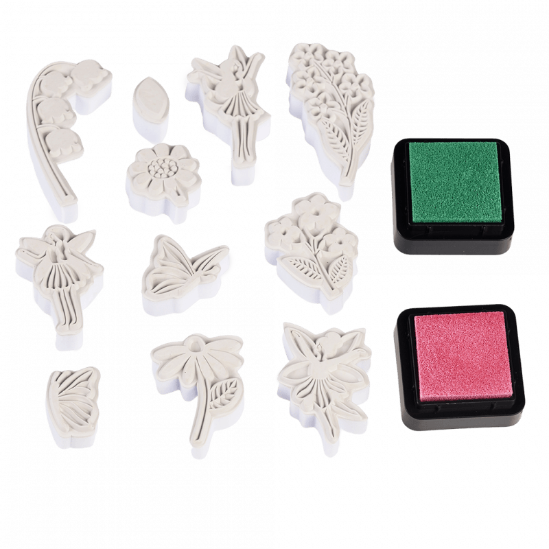 - Zawartość zestawu: 11 stempli i 2 wodne tusze w kolorach (różowym i zielonym)