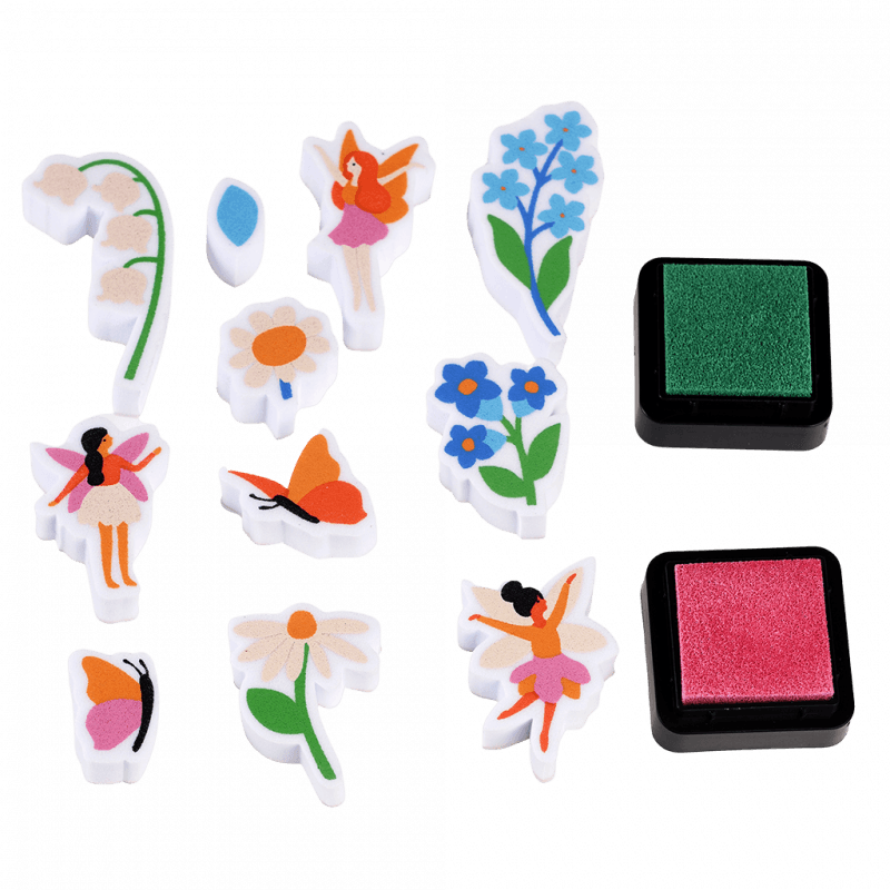 Zestaw 11 stempelków dla dzieci z dwoma kolorami tuszy w zestawie. Komplet do kreatywnej zabawy w ozdabianie, zachęcający dzieciaki do ekspresji twórczej. Pieczątki z wróżkami, roślinami i motylami świetnie nadają się do aktywności w większej grupie. Mogą również posłużyć za nagrodę i narzędzie motywujące dzieci do wykonania jakiegoś zadania. Wodne tuszy są nietoksyczne i bezpieczne dla wrażliwej skóry dziecka.