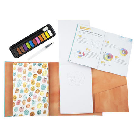 Skład zestawu: 1 x kompleksowy przewodnik po malowaniu, 1 x pędzelek wodny, 12 x akwarele, 1 x mała gąbka do blendowania kolorów, 1 x paleta, poręczne pudełko do przechowywania