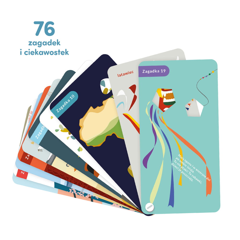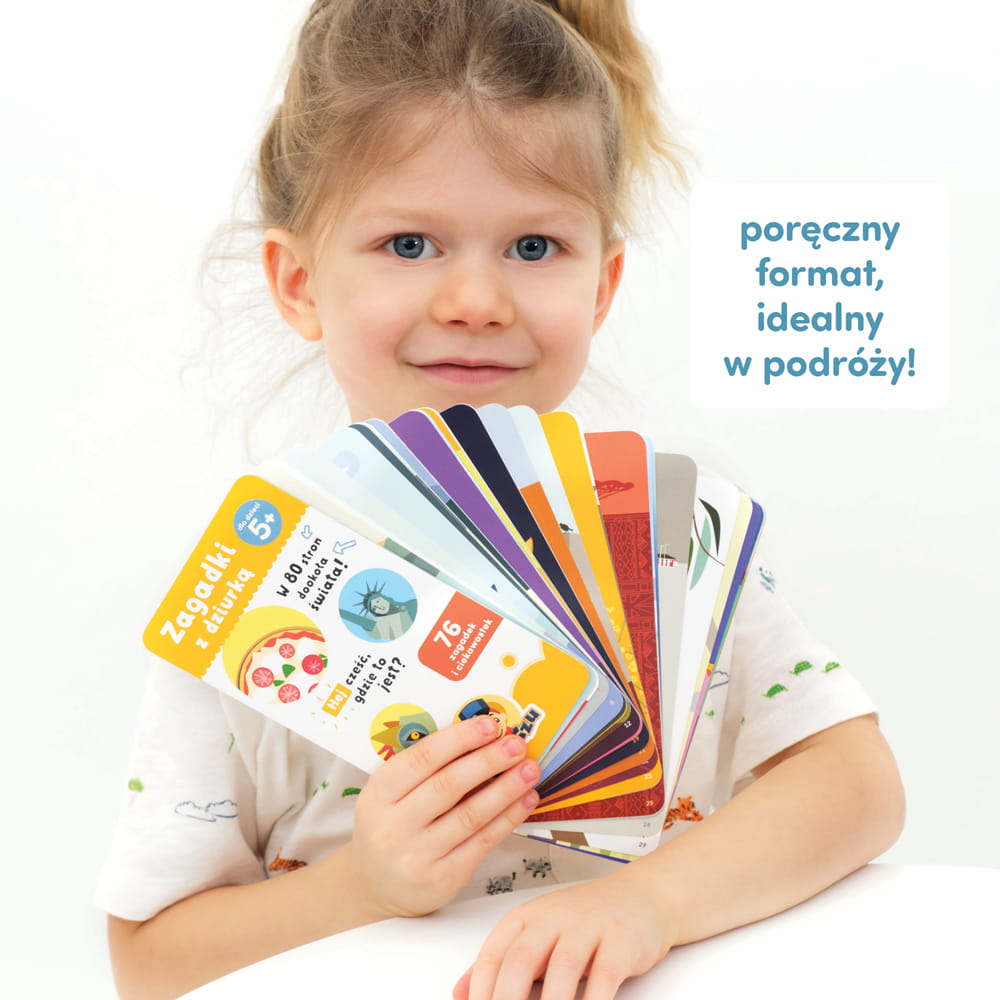 Przeczytajcie rymowaną zagadkę i sprawdźcie odpowiedź na następnej stronie. Zauważcie, że przez dziurki widać fragmenty ilustrowanych odpowiedzi – to niezła podpowiedź… lub zmyłka! Następnie przeczytajcie ciekawostki i rozwiążcie zadania, i dowiedzcie się więcej o tym, co was zainteresowało. To doskonały sposób na naukę o świecie. Zwróćcie uwagę, że jeśli zaznaczycie na globusie miejsca związane z kolejnymi zagadkami, objedziecie cały świat! Gdy wszystkie odpowiedzi będą już dobrze znane, wymyślajcie własne pytania. Zagadki sprawdzą się jako inspiracja do tworzenia własnych opowieści, planów wycieczek i rysunków. Bawcie się, uczcie i dajcie się porwać wyobraźni. Książeczki z edukacyjnej serii sprawdzają się w domu i w podróżach, nie tylko tych dookoła świata.