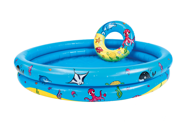 Zestaw: basen, koło treningowe i piłka plażowa od The Swim Essentials. Zestaw składający się z okrągłego dmuchanego baseniku dla dzieci o średnicy Ø 122 cm. Basen posiada dwa dmuchane pierścienie, które zapewniają stabilność całej konstrukcji. Koła treningowego dzięki któremu Twoje dziecko może czuć się bezpiecznie podczas zabaw w morzu, jeziorze czy basenie, oraz piłki plażowej która idealne przyda się do zabaw nad wodą, na plaży, w ogrodzie lub w basenie. Dmuchana piłka o średnicy 42 cm na pewno spodoba się każdemu kto lubi aktywnie spędzać czas na wakacjach. Zestaw zapewni super zabawę na świeżym powietrzu.
